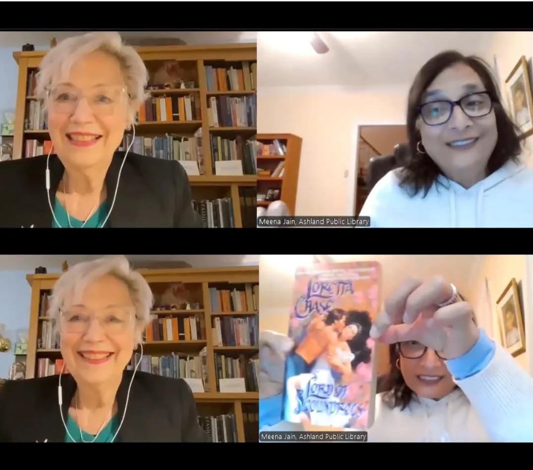 If you were not there, you can watch us at your convenience here on the Ashland Public Library YouTube channel. The program is titled Q&A with romance writer (and nerdy history girl) Loretta Chase.