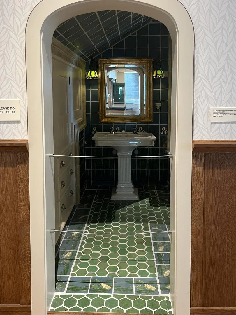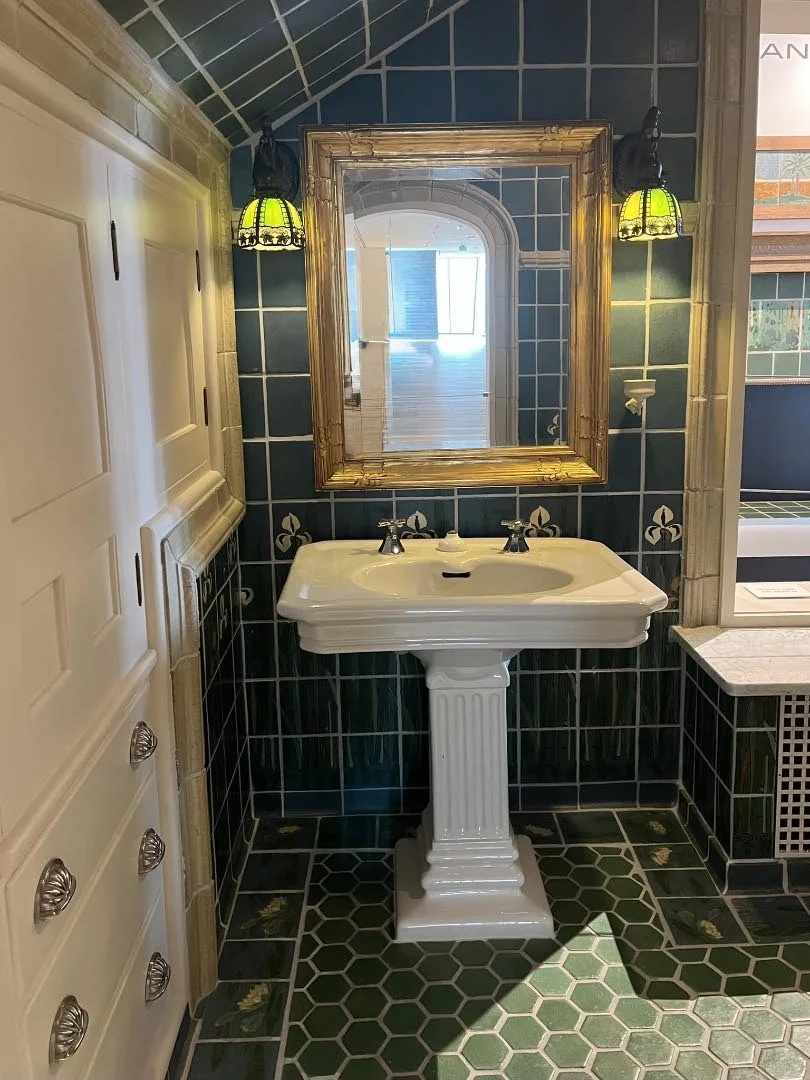 And yes, I do like a pretty bathroom. Some years ago, I posted a series of photos, “Loos of London.” This one, done by the Grueby Faience and Tile Company (lamps aren’t all they made), I want in my house.
